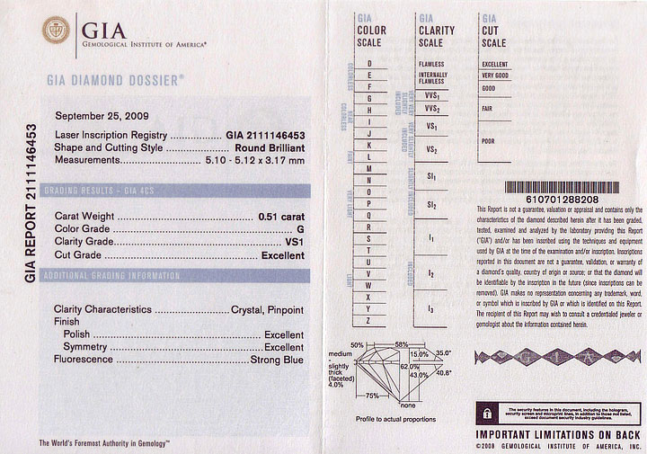 Certifikát diamantu (Diamond Report) osvědčuje kvalitu diamantu, aniž by odhadoval jeho cenu. Certifikát 4C by měl obsahovat barvu čistotu a brus, stejně jako hmotnost, míry výšky, průměr rundisty, náčrty vnitřních a vnějších charakteristik, detaily poměrů symetrie a fluorescenční vlastnosti. Obvykle se vydává pro kameny větší než 0,47ct.